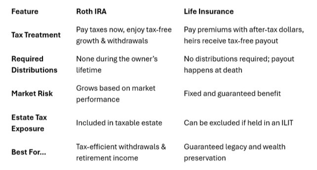 If you’re like Mark, Susan, or Tom, your retirement and legacy goals will shape the strategy for your wealth. There’s no one-size-fits-all solution, but by understanding the key differences between Roth IRAs and Life Insurance, you can make a more informed decision: